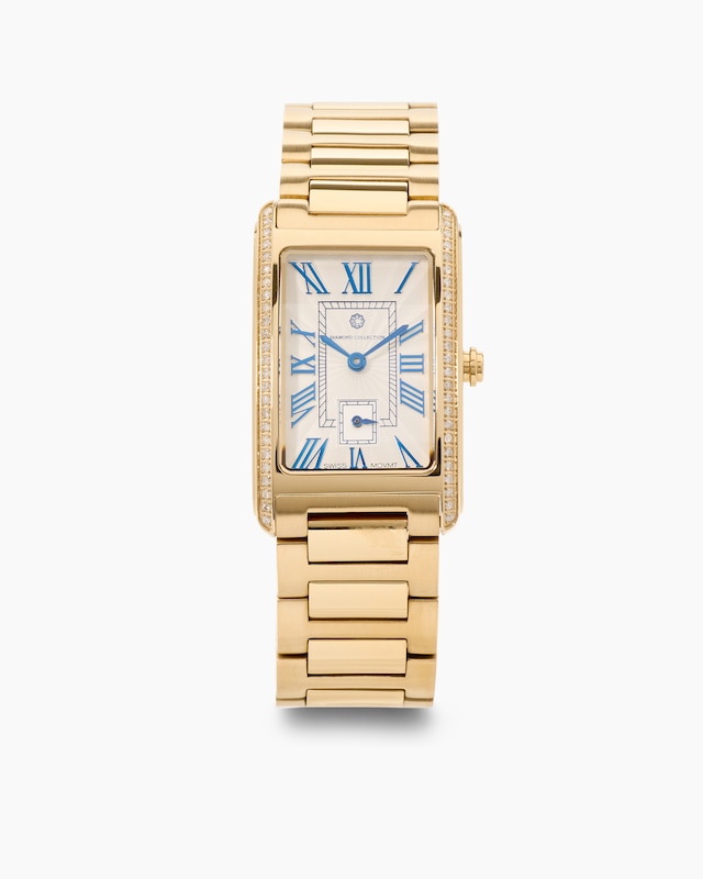 124 Brillanten und stilvoll elegantes Design machen aus der Uhr von Diamond Collection buchstäblich ein Schmuckstück. Die wertvollen Steine flankieren die beiden Längsseiten des schmalen, viereckigen Gehäuses und strahlen Ihnen bei jedem Blick auf die Uhr und jeder Geste entgegen. Ein besonderer Hingucker: Das gelbgoldfarben IP-beschichtete Modell ist auf dem weißen Perlmutt-Zifferblatt mit römischen Ziffern in herrlichem Blau versehen. Ebenso sind die Zeiger in Blau gehalten. Die außergewöhnliche Farbkombination gibt der Uhr einen wunderbar frischen Touch. Das silberfarbene Modell ist hingegen rundherum Ton in Ton, d.h. in Silbertönen und Weiß, gehalten. Stilvolle Eleganz, die jeder Garderobe das gewisse Etwas verleiht. Das ist Brillantschmuck für den Alltag - praktisch und glamourös.