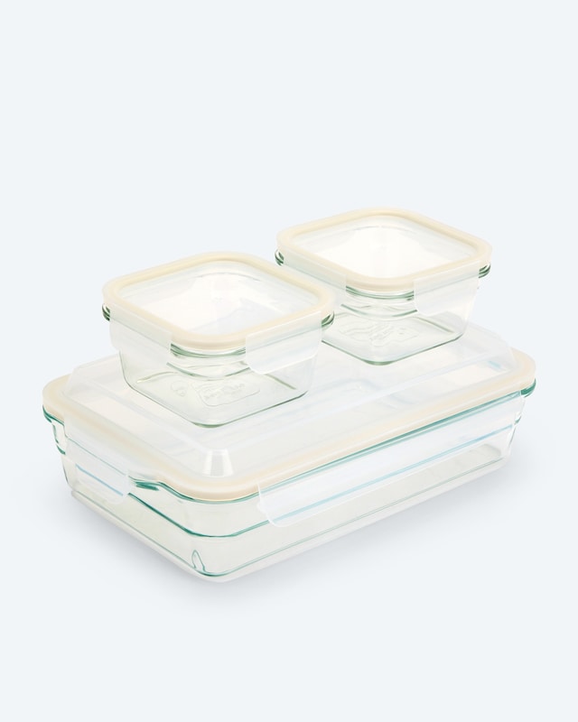 Dieses hochwertige Glasslock Set besteht aus zwei rechteckigen und einem quadratischen Behälter aus bruchsicherem Glas. Die praktischen Frischhaltedosen eignen sich für frische Lebensmittel und gekochte Speisen gleichermaßen, wobei das Glas weder Geruch noch Farbe des Inhalts annimmt. Alle Behälter können bequem in den Kühl- und Gefrierschrank, in die Mikrowelle und Spülmaschine sowie in den Backofen gegeben werden. Ein weiteres Plus sind die luftdichten und auslaufsicheren Deckel. Ein perfektes Set für die moderne Küche.