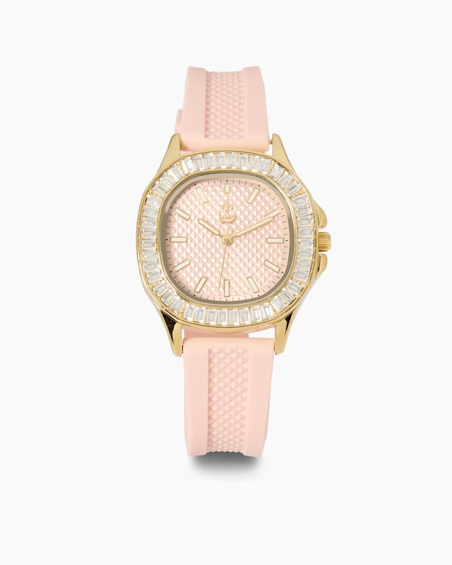 Sportive Eleganz trifft auf zeitgemäßes Design – diese Damenuhr ist der perfekte Begleiter für alle, die Wert auf Stil und Komfort legen. Das hochglanzpolierte Edelstahlgehäuse mit einem Durchmesser von ca. 36 x 36 mm wird von 44 funkelnden Zirkonia im Baguetteschliff geziert, die in einer eleganten Kanalfassung eingearbeitet sind. Das Zifferblatt in harmonischer Armbandfarbe mit Index-Linien und dem dezenten AP-Logo unter 12 Uhr sorgt für eine klare Ablesbarkeit. Das angenehm zu tragende Silikonarmband mit Dornschließe bietet höchsten Tragekomfort und passt sich perfekt Ihrem Handgelenk an. Die geriffelte Krone und das Mineralglas runden das durchdachte Design ab. Mit einer Wasserdichtigkeit von 3 ATM ist die Uhr vor Spritzwasser geschützt – ideal für den Alltag. Das präzise Quarzwerk garantiert zuverlässige Zeitanzeige. Die IPG-Beschichtung sorgt für langanhaltenden Glanz und hohe Abriebfestigkeit. Was die Qualität unserer Schmuckstücke angeht, gehen wir keine Kompromisse ein. Aus diesem Grund werden unsere Schmuckwaren von unserer Qualitätssicherung und seitens des Lieferanten strengsten Prüfprozessen unterzogen. Unter anderem beinhalten unsere Prüfprozesse Prüfungen auf Konformität mit den Bestimmungen der Schweizer Edelmetallkontrollgesetzgebung. Zum Batteriewechsel/Akkuwechsel bitte einen Fachhändler aufsuchen. Wasserdicht 3 ATM: geringe Berührung mit (Spritz-) Wasser (Z. B. Händewaschen ohne unter den Wasserstrahl zu geraten, Regen, Schweißtropfen). I.P. = Ionen Plating (der 3. Buchstabe variiert nach Verfahrensweise) Beim Ionen Plating wird der zu veredelnde Gegenstand mit gasförmigem Material beschossen. (Quasi Aufdampfen in einem Autoklaven = Gefäß zum erhitzen unter Druck). Die hohe Abriebfestigkeit wird häufig durch Vorbeschichtung mit einem Titan Oxid erreicht. Diese Schicht ist sehr hart, gelbgold oder silberfarben, und vergleichsweise rau. So wird die in der Vertiefung liegende Beschichtung gut gegen Abrieb geschützt. Ein Accessoire, das sportlichen Chic mit femininer Raffinesse verbindet und Sie stilvoll durch den Tag begleitet.