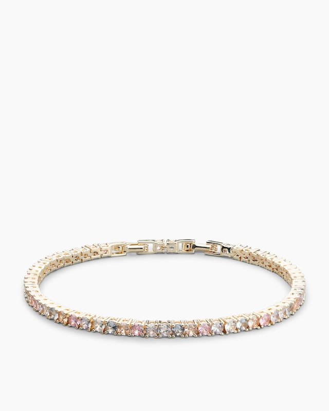 Farbenfroh, verspielt und voller Lebensfreude – dieses Tennisarmband setzt auf die bezaubernde Kraft pastellfarbener Akzente und wird zum strahlenden Begleiter für jeden Tag. Das Armband besteht aus hochglanzpoliertem, vergoldetem Messing und ist mit insgesamt 57 facettierten Zirkonia in zarten Pastelltönen besetzt. Die runden Zirkonia in Weiß, Rosé, Lila, Blau und Champagner sind in Krappenfassungen gehalten und funkeln bei jedem Lichteinfall wunderschön. Jeder einzelne Stein mit einer Größe von ca. 3 mm trägt zum harmonischen Gesamtbild bei und verleiht dem Schmuckstück eine verspielte Eleganz. Ein abnehmbarer Easylink ermöglicht es Ihnen, die Länge individuell anzupassen und das Armband perfekt auf Ihr Handgelenk abzustimmen. Der sichere Klappverschluss sorgt für einen festen Halt und garantiert, dass Ihr Schmuckstück jederzeit sicher sitzt. Mit einer Länge von ca. 18,5 cm und einer Verlängerung von 2 cm passt sich das Armband flexibel an und wird zum unverzichtbaren Accessoire für stilbewusste Trägerinnen. Was die Qualität unserer Schmuckstücke angeht, gehen wir keine Kompromisse ein. Aus diesem Grund werden unsere Schmuckwaren von unserer Qualitätssicherung und seitens des Lieferanten strengsten Prüfprozessen unterzogen. Unter anderem beinhalten unsere Prüfprozesse Prüfungen auf Konformität mit den Bestimmungen der Schweizer Edelmetallkontrollgesetzgebung. Ein farbenfrohes Statement-Piece, das Ihre Persönlichkeit perfekt unterstreicht und jeden Look mit einem Hauch von Eleganz und Fröhlichkeit bereichert.